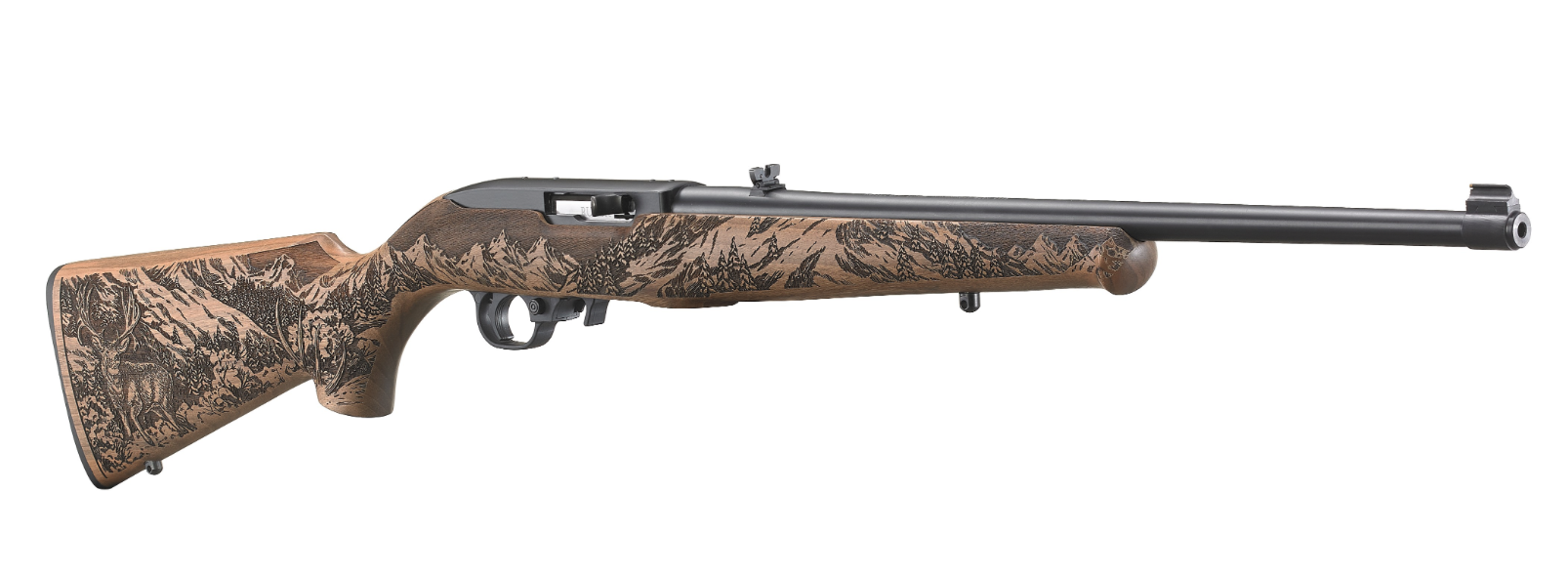 Ruger TALO 10/22 Mule Deer, Semi-automatic, Rifle, 22 LR, 18.5″ Barrel, Blued Finish, Altamont Walnut Stock Carved with Mule Deer Scene, 10Rd