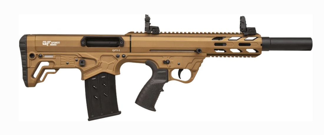 The GFY-1 bullpup shotgun is compatible with MKA-1919 magazines and accepts 2 3/4 and 3-inch 12ga ammo. The GFY-1 features adjustable flip-up sights, as well as a bottom Picatinny rail for mounting accessories. Red dots and reflex sights can also be installed on the GFY-1 for faster target acquisition.